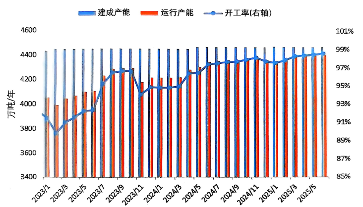 2025上半年,中國(guó)鋁行業(yè)生產(chǎn)總體較為穩(wěn)定,沒(méi)有出現(xiàn)因各種不可抗力因素導(dǎo)致的規(guī)模化減產(chǎn),且隨著四川、貴州、青海等省/區(qū)電解鋁企業(yè)的復(fù)產(chǎn)和新建項(xiàng)目投產(chǎn),上半年生產(chǎn)能力得到持續(xù)提升。安泰科統(tǒng)計(jì),截至2025年6月底,中國(guó)電解鋁建成產(chǎn)能4470萬(wàn)噸/年,其中運(yùn)行產(chǎn)能4405萬(wàn)噸/年,較2024年底增加49萬(wàn)噸。1-6月份產(chǎn)能利用率達(dá)98.1%,不斷刷新歷史新高,比去年同期高2.4個(gè)百分點(diǎn):其中6月份產(chǎn)能利用率達(dá)98.5%,較2024年末高0.9個(gè)百分點(diǎn)。2025上半年,中國(guó)電解鋁產(chǎn)量約為2184萬(wàn)噸,同比增加2.4%。