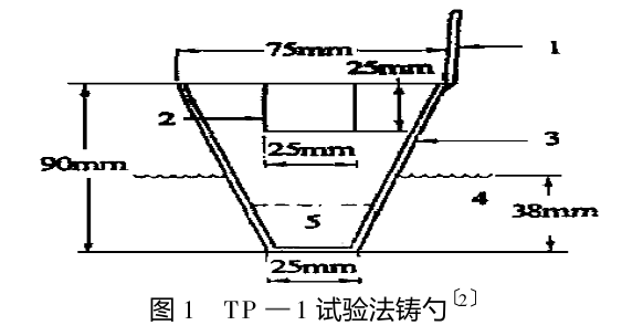 能保溫(718±5) ℃的 11kg 鋁的石墨坩堝電阻爐;標準合格的熱電偶;兩個錐形鑄勺或鑄模(圖1),內側涂云母薄層外側噴石墨;鑄勺預熱(至316℃) 爐;計時器;石墨攪拌棒;簡易夾鉗;水冷卻槽(圖2) ;工作服和面罩等。