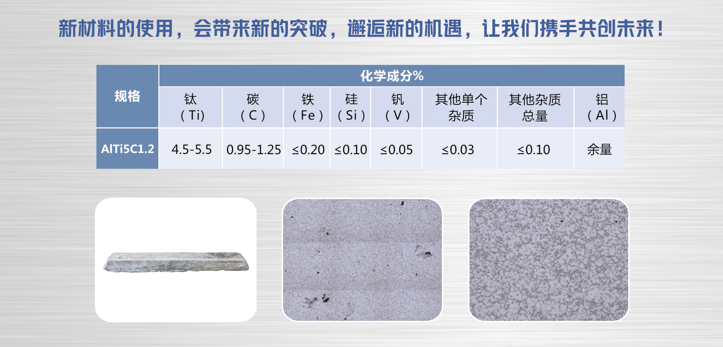 1.AITi5C1.2中TiC陶瓷顆粒時(shí)效性可達(dá)6個(gè)小時(shí),適用于爐內(nèi)添加,操作簡(jiǎn)便,適用于大部分需要提升機(jī)械性能的變形鋁合金產(chǎn)品及鑄造鋁合金產(chǎn)品;