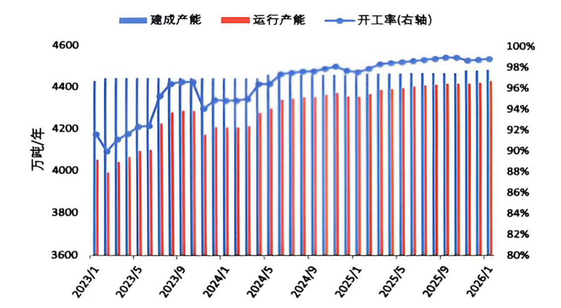 2026年1月,國內(nèi)電解鋁建成產(chǎn)能與運行產(chǎn)能均維持高位運行。截至1月底,建成產(chǎn)能4488萬噸/年,運行產(chǎn)能4434萬噸/年,環(huán)比增加9萬噸/年,整體產(chǎn)能規(guī)模保持穩(wěn)定,運行產(chǎn)能小幅提升。2026年年初,電投能源旗下扎哈淖爾電解鋁二期項目35萬噸/年進入試生產(chǎn)階段,待項目全面投產(chǎn)后,該公司電解鋁總產(chǎn)能將達到161萬噸;1月上旬,包鋁電解一廠完成1182號電解槽啟動,全系列1166臺電解槽全部運行,生產(chǎn)線實現(xiàn)滿負荷生產(chǎn);同期,天山鋁業(yè)140萬噸電解鋁綠色低碳能效提升改造項目產(chǎn)能逐步釋放。當前國內(nèi)產(chǎn)能已接近“天花板”,行業(yè)開工率維持在98%以上,后續(xù)產(chǎn)量釋放與產(chǎn)能擴張均已逼近極限。